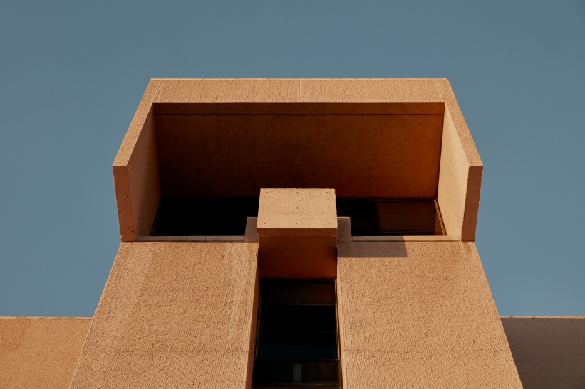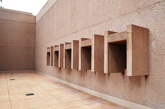The unusual color of the exposed concrete was achieved by adding reddish sand and is intended along with the bush hammered surface to forge a link to the similarly colored backdrop of the Rocky Mountain crags. Antithetical to many other brutalist builds, the idea here for the exterior design was to consciously eliminate any sense of human scale.