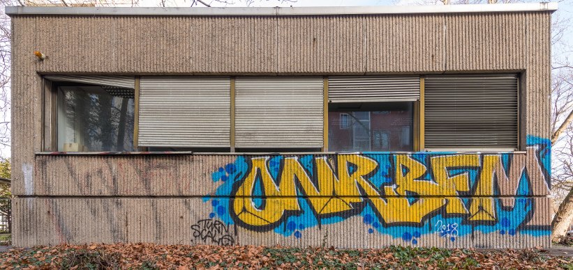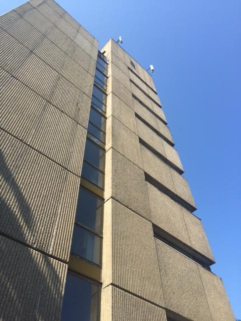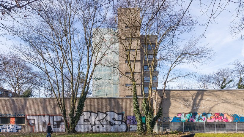 Horizontal and vertical window bands divide the concrete panel façade with vertical recesses extending over the entire building. Winner of Cologne Architecture Prize of 1971.