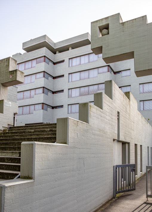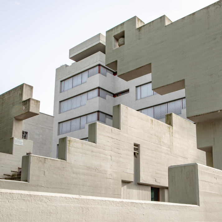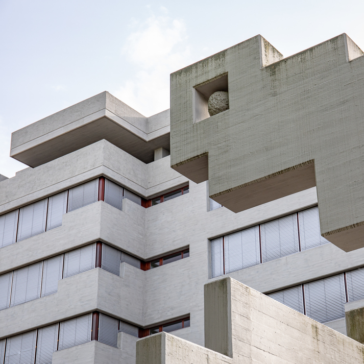 The building of Brunnmatt School in Basel consists of several building sections and sculptural objects made of exposed concrete connected by an environmental design concept. Striking examples for the sculptural quality of the ensemble are a staged open staircase flanked by sculptural elements or a geometrically designed fountain on the schoolyard. The details—which include joints, edges and the formwork pattern of the béton brut—were carefully planned through for the entire complex. The result is a highly individual architecture that contrasts with the aspirations for comprehensive industrialization in the field of construction or the sober industrial functionalism of the 1960s.