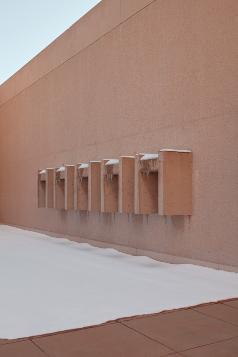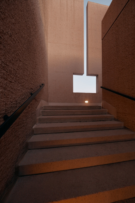 The unusual color of the exposed concrete was achieved by adding reddish sand and is intended along with the bush hammered surface to forge a link to the similarly colored backdrop of the Rocky Mountain crags. Antithetical to many other brutalist builds, the idea here for the exterior design was to consciously eliminate any sense of human scale.