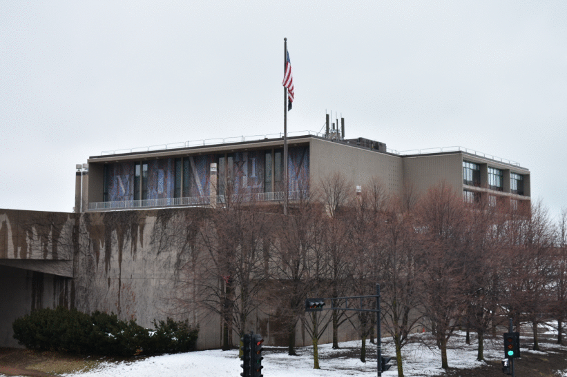 Wolfgang Pehnt cited the Milwaukee County War Memorial in his essay “Was ist Brutalismus?” (“What is Brutalism?”) from 1960 as an example for the global spread of Brutalism. The building separates three functions in three spaces: A platform, housing a museum, an inner courtyard, acting as the memorial, and the cantilevered volumes for conference rooms. Drawing from Le Corbusier, these rooms are elevated on polygonal pilotis.