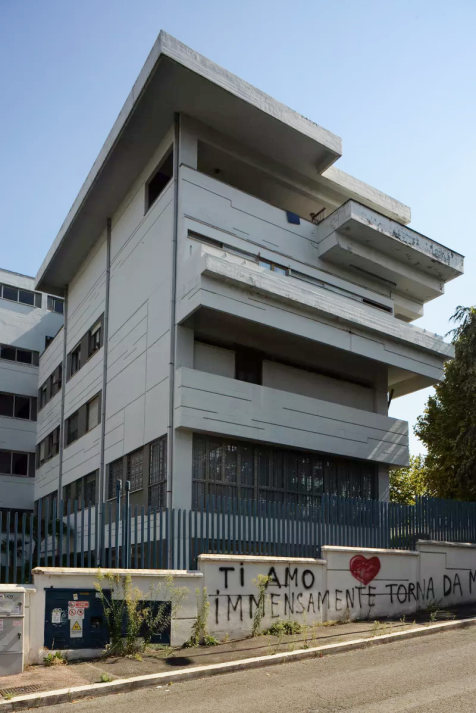 Today it houses the Pia Un. Ancelle Di Maria Immacolata Al Servizio Della Chiesa. Originally exposed concrete later painted white gray.
