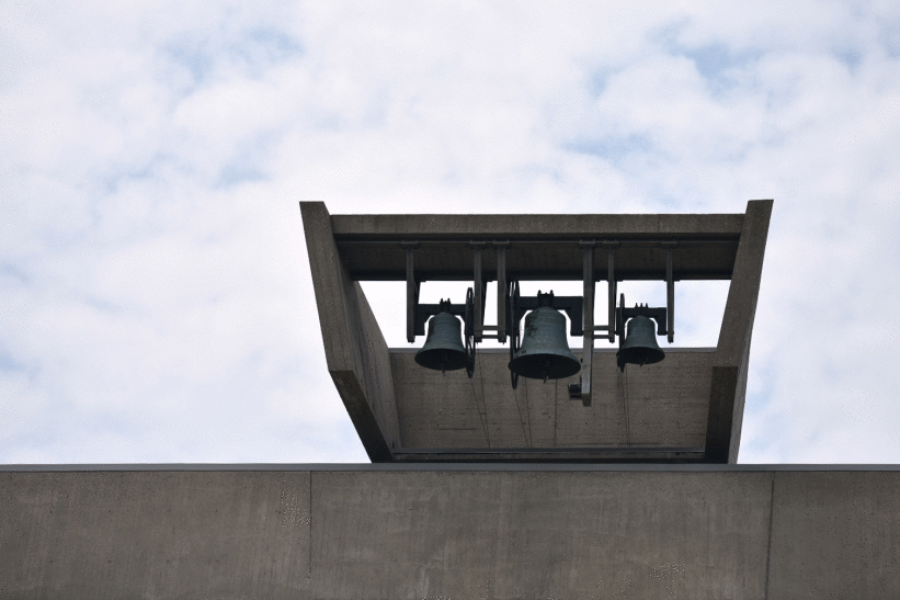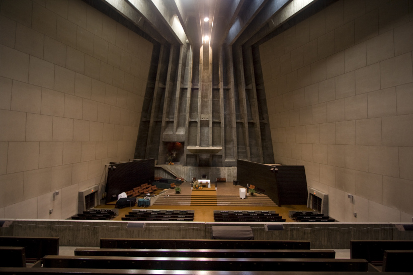 Marcel Breuer was commissioned to design the church in 1961. Construction began in 1964. The sacred design approach focuses on creating a profound religious experience through spatial arrangement, light, materials, and size rather than lavish ornamentation. The trapezoidal front wall of the exposed concrete church, which functions like a “banner” with a cross relief cast into the concrete, gives the it its distinctive appearance. Above it is the bell tower with three large bells that protrude beyond the front wall. The sanctuary has no windows except for a few skylights and is accessed from a slightly low balcony, which enhances the impressive experience of entering the enormous height of the nave. The sides of the entrance are decorated with red-orange and blue-green stained glass windows by Studio Roemer-Millard. The floor of the church is made of bricks and sloped like a theater, allowing for a better view of the altar. The latter is made of a single piece of white granite. Above it is a concrete canopy illuminated from below, and behind it are twelve concrete columns representing the twelve apostles.