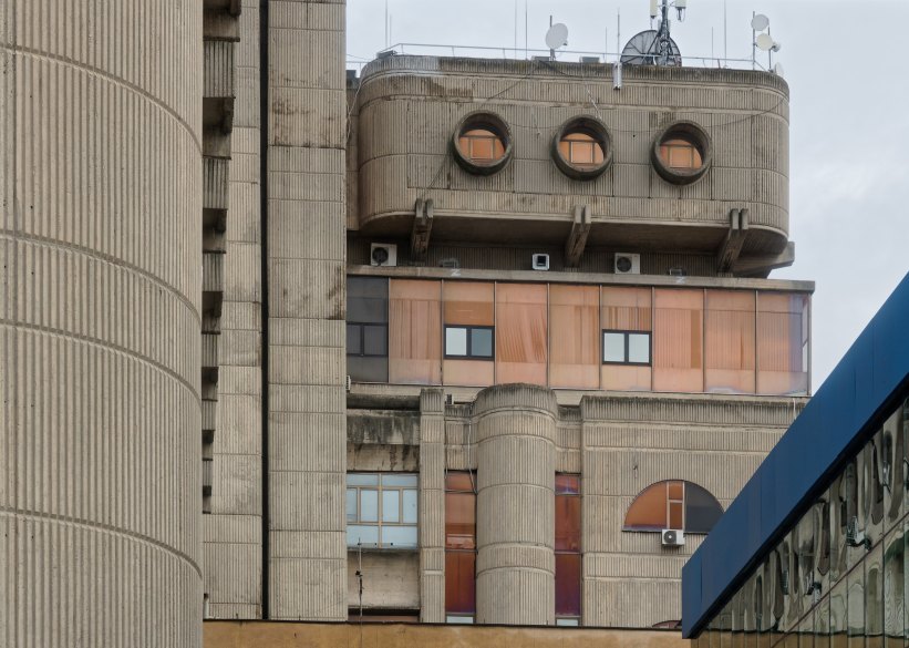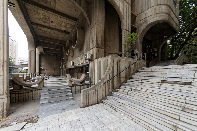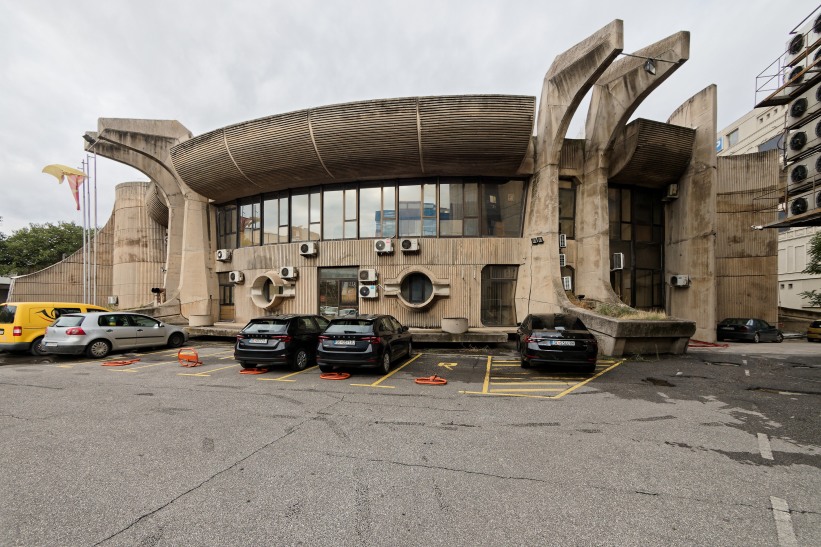 In the first, unbuilt version of the TC [Telecommunication Center] project (1968), Konstantinov proposed the public plaza of epic scale, framed by the Metabolist system of circular service cores and suspended horizontal blocks. [...] In the realized version of TC (1972C–1974), the public plaza is discarded and the main building became an asymmetric, fortress-like structure serviced by utility cylinders. With laconic ease Konstantinov noted that the arched ground and fourth floors are references to the “Balkan medieval monasteries and churches,” while at the same time the whole building “resembles a space station.” In the postal services hall (1979C–1981), the final stage of the TC, sharp concrete ribs that bloom over the top of the dome are at the same time archaic and futuristic, denying any stylistic logic.