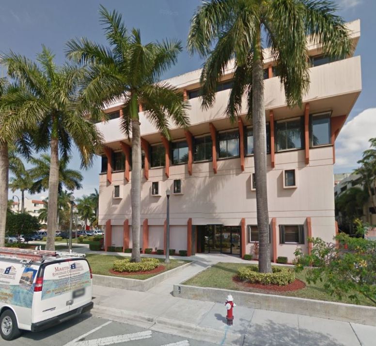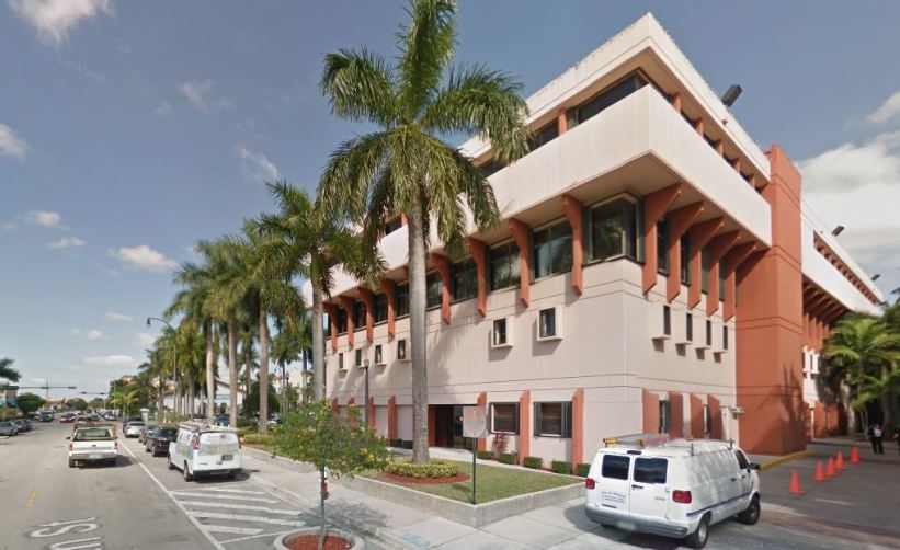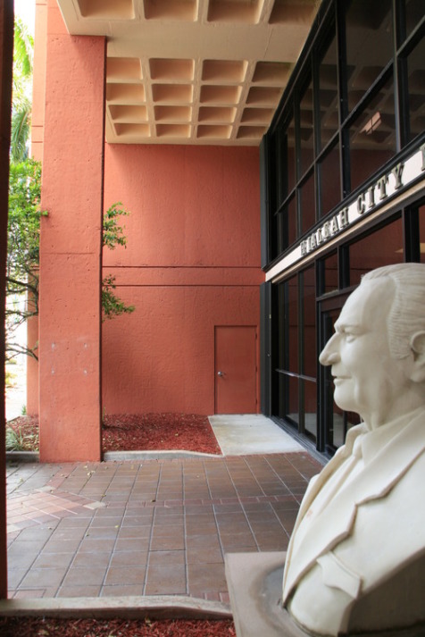 Hialeah City Hall is a rectangular building with a cantilevered top floor, whose concrete façade was originally visible.