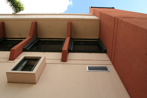 Originally exposed concrete today painted in various hues.