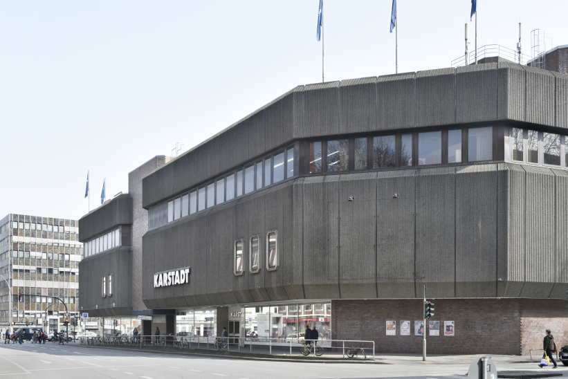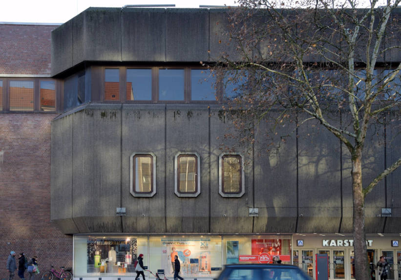 The building was constructed on the site of an older Karstadt building to meet demands for larger sales areas as well as parking space due to increasing car ownership. Owing to the bunker-style look of the building, the reception was controversial from the very start. The façade is dominated by massive corrugated concrete panels, angled at top and bottom and intersected by brickwork walls. Written by Amelie Rogall and Boris Dorau