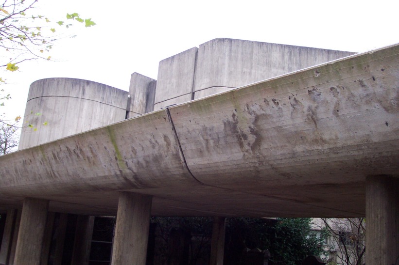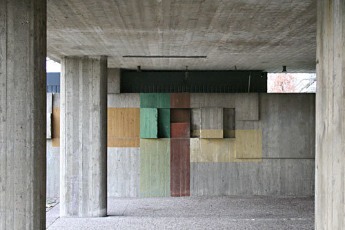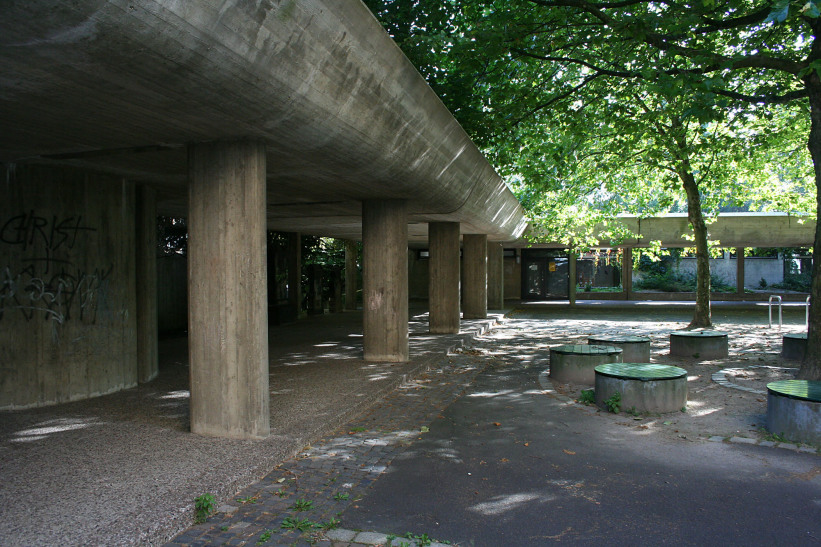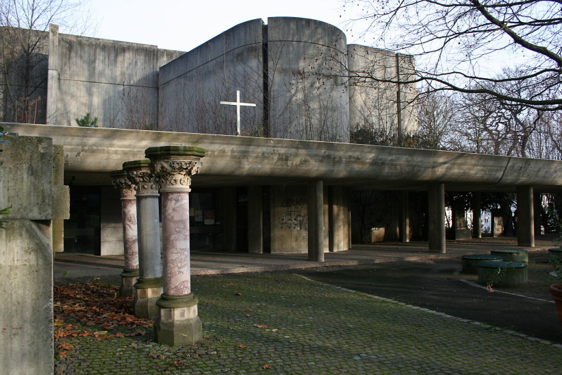 The building is a replacement for the neo-gothic church at this place which was destroyed during WWII. Only the belfry remained. Like a huge sculpture the monolithic concrete building fits into the park of the Altstädter Friedhof. Church and community center are connected by arcades reminiscent of a cloister. In the middle there is a void where the neo-gothic nave was situated, thus creating a quiet courtyard, which is shielded from nearby road traffic. The nave is decorated with colored concrete sculptures by Emil Kiess, the chapel’s windows are designed by Sigrid von Liebenstein. Written by Torsten Ahlers