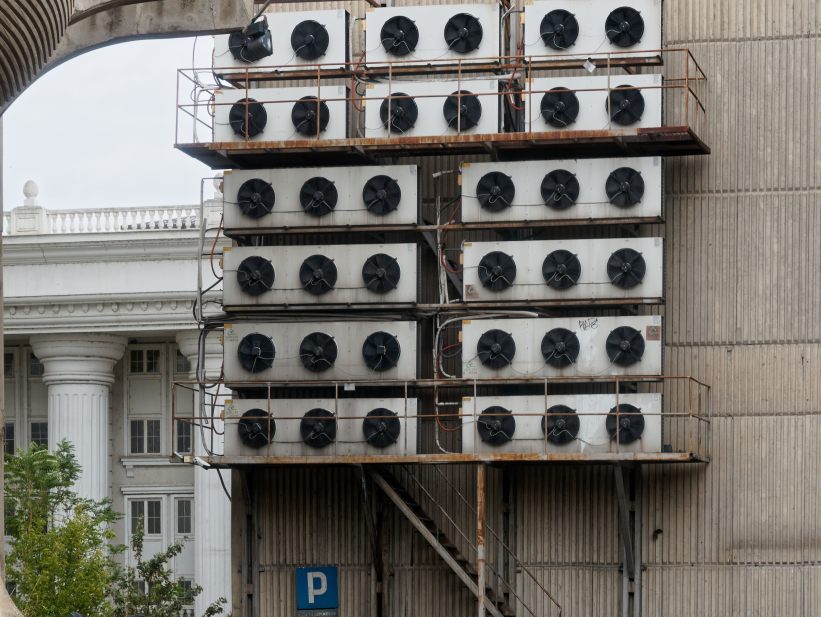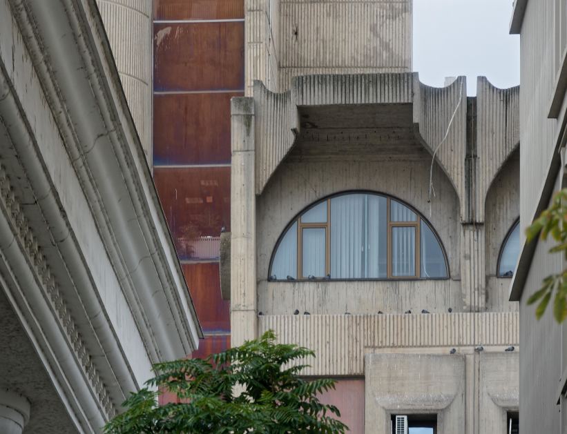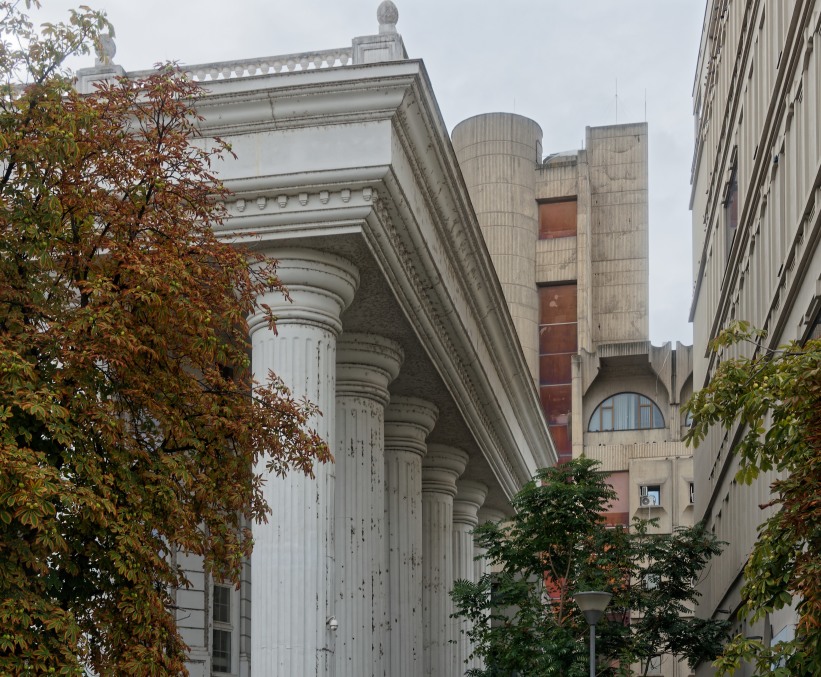 The originally brutalist building has an upwardly rounded concrete canopy supported by angular columns. The building is the third phase of construction of the huge Post Office and Telecommunications Center in Skopje, the first two phases of which were carried out by Janko Konstantinov. Shtaklev’s building used to house a Republic Dispatch Center and the Public Electricity Company.