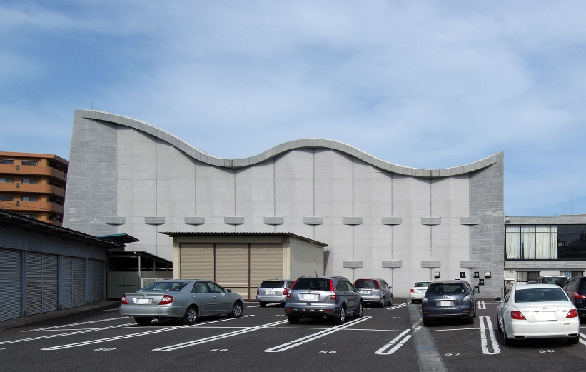 Elongated rectangular exposed concrete hall with characteristic wave-shaped roof.