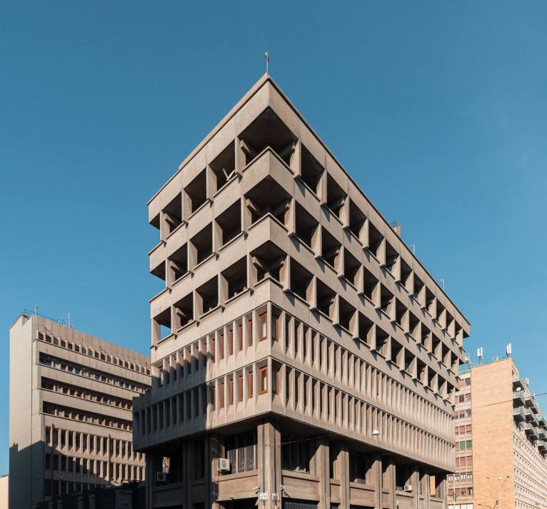 The Banca d’Italia in Catania is a monumental administrative building with a strictly structured façade and an emphatically block-like appearance. Despite its natural stone cladding, the architecture exhibits key features of Brutalism—such as the massive overall form, the deep sculptural relief of the façade and the uncompromising appearance. The building is exemplary of a late modern architectural language that combines brutalist design principles with local materials and rationalist clarity.