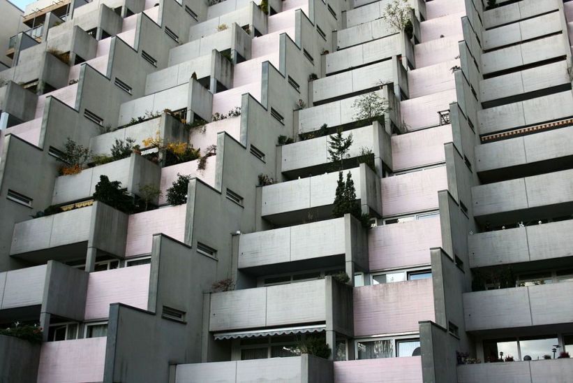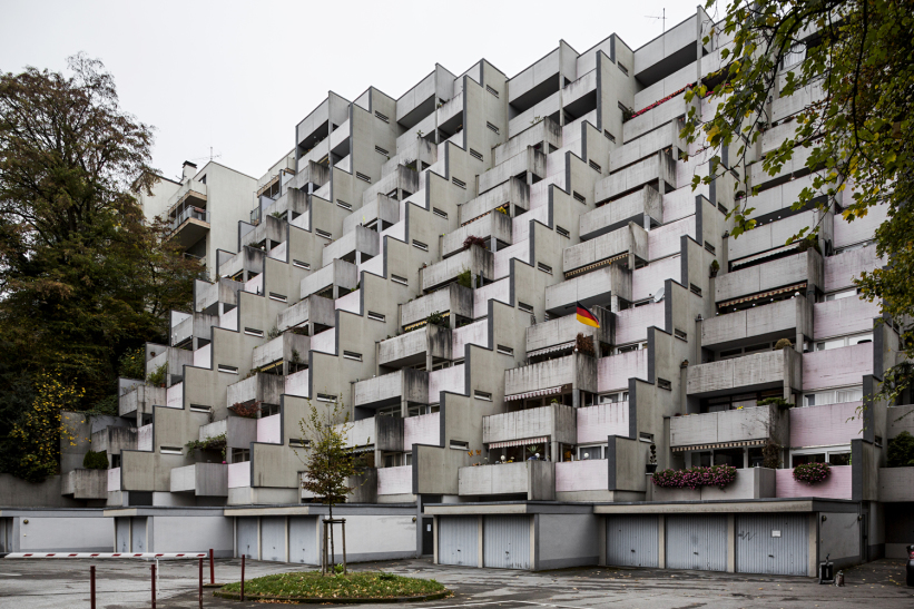 Staggered back, 12 exposed concrete floors rise at the foot of the Nützenberg. The soft coloring is striking, light pink next to the light grey of the exposed concrete. Embedded in the green of the mountain in the background, the building contrasts itself.