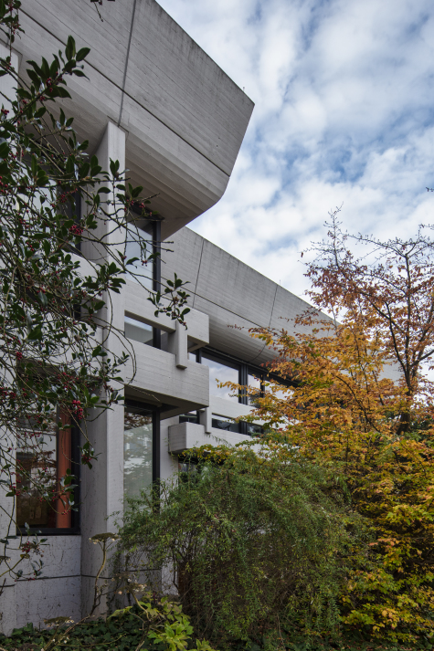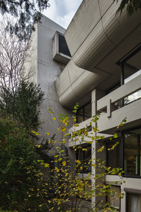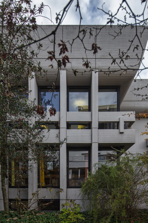 The reinforced concrete building is characterised by a massive attic, concrete columns support the roof and attach narrow concrete balconies to the façade. The glass façade is supported by a post and mullion construction and contrasts with closed concrete façade elements. -
