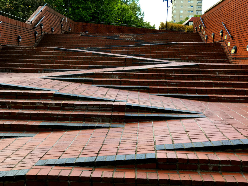 Brick brutalist campus building. Ramps, stairs and towers make the construction to a landmark.