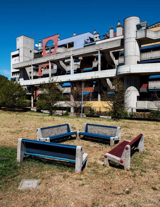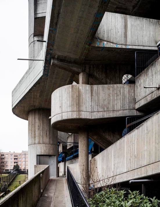 This residential building, influenced by Hugh Wilson's Cumbernauld Town Centre, is with all its external pedestrian passages that assure the access to each apartment and connect the floors without any internal loss of space a huge complex and interesting megastructure. Colorful geometric elements contrast with the gray exposed concrete and give the building its distinctive appearance.