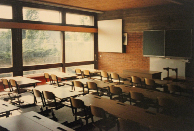 From an architectural and layout point of view, this school building, executed entirely in the spirit of Brutalism, is to be seen as the successor to the Secondary School Purbach, but from a layout point of view it is supplemented by the terrace school typology, which was realized for the first time in the Großfeldsiedlung. In terms of interior design, the Felixdorf elementary school also features the concept already used in Purbach and Schwadorf, but with the innovation that the Felixdorf elementary school was the first to use orange chip carpeting as flooring in almost all areas. The Felixdorf elementary school and the Dopschstraße elementary school can thus be seen as a further development of the hall school type, in which Szauer and Fickl combined the typology of the terrace house, which was widespread in residential construction at the time, with that of the hall school.