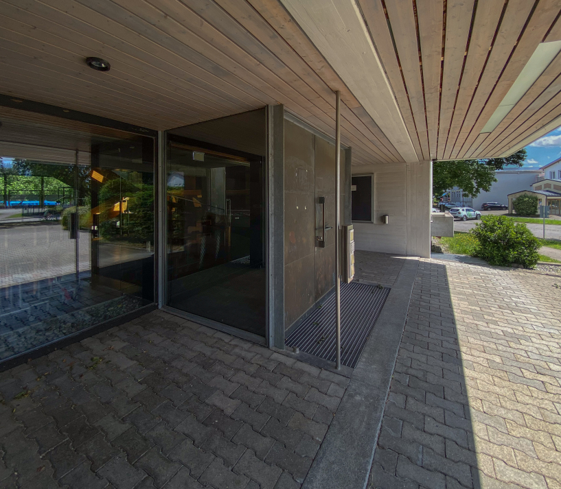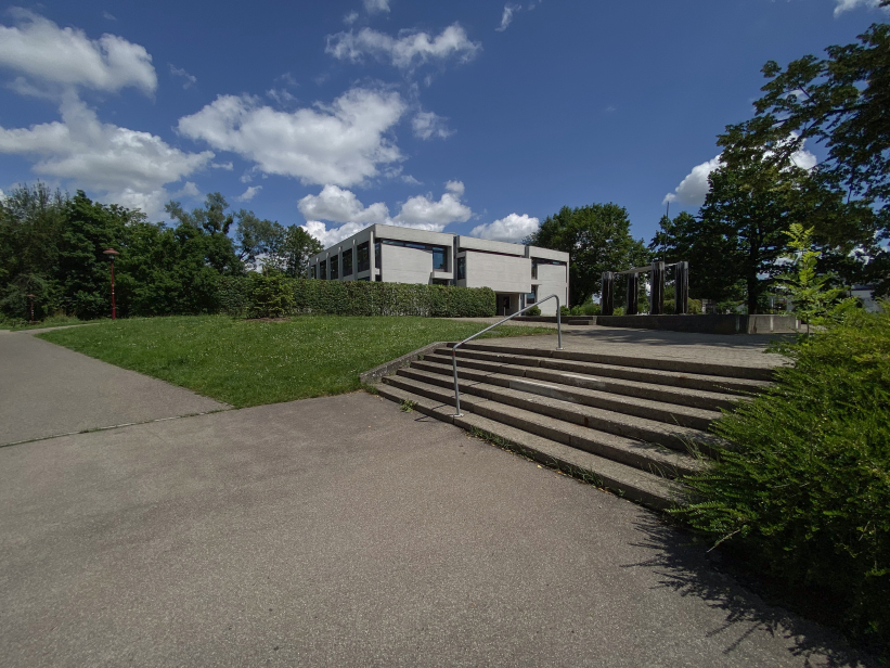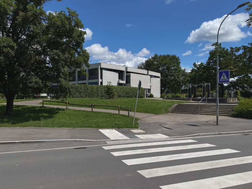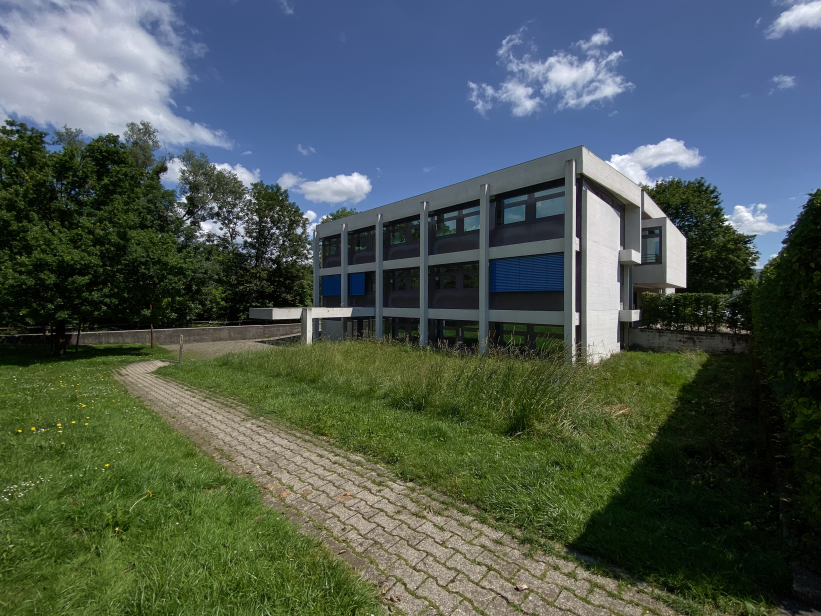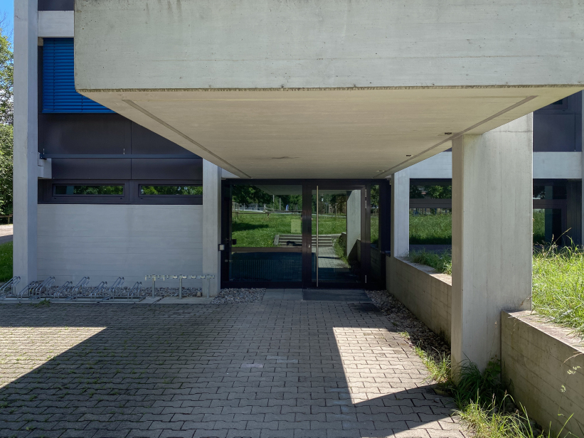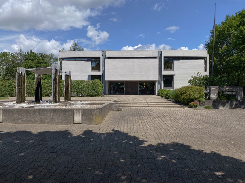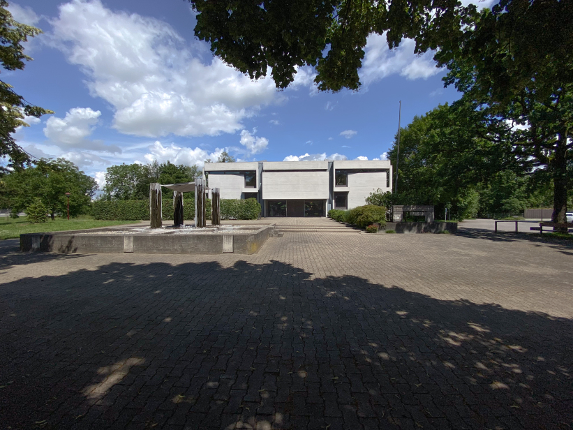 The building was placed right at the entrance to Kehlen in the middle of a spacious green area. Due to its proximity to the Schussen river, the building site was prepared with a large base plate first. Kley then errected a three-storey reinforced concrete building with a flat roof on top. The building contains administration rooms, a community library, a foyer for events and exhibitions and community rooms. The façade with many window areas is partly structured by protruding concrete beams and pillars in lattice structures, but is also partly closed by differently sized exposed concrete squares with a horizontal board pattern. This creates a varied and modern impression.