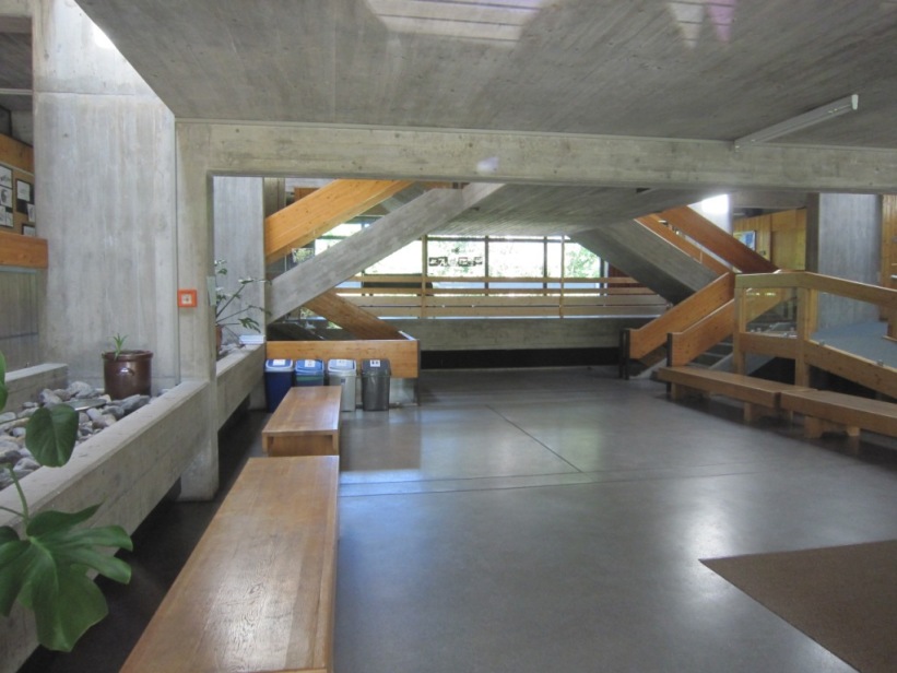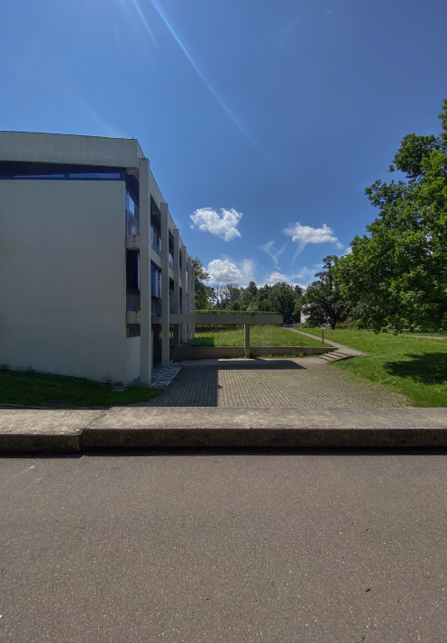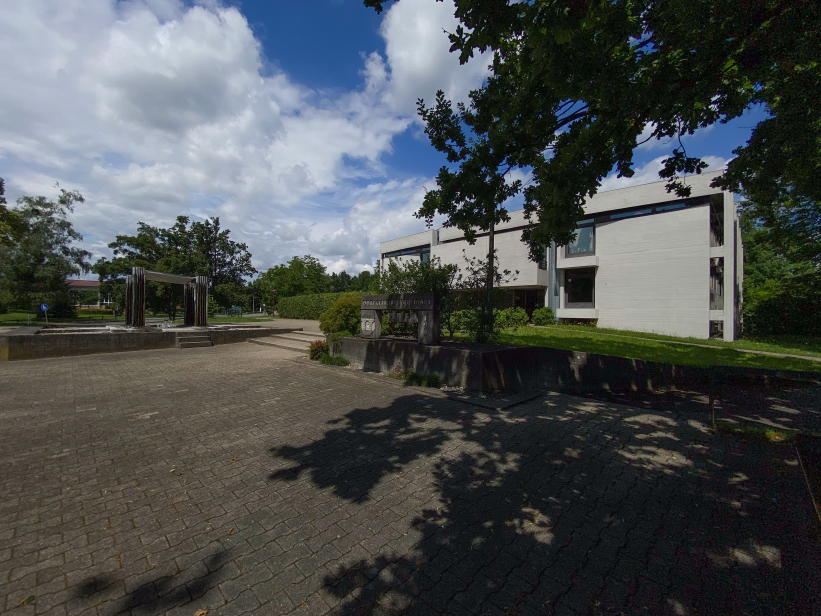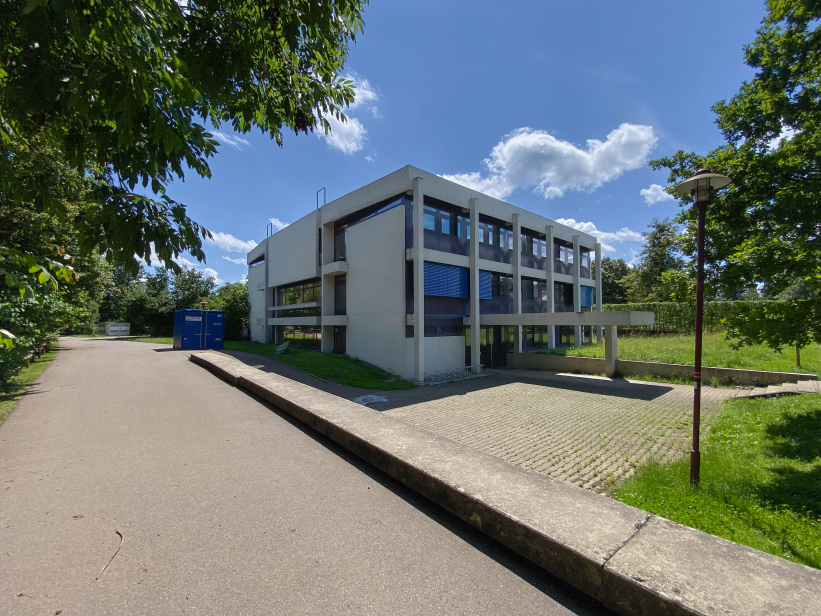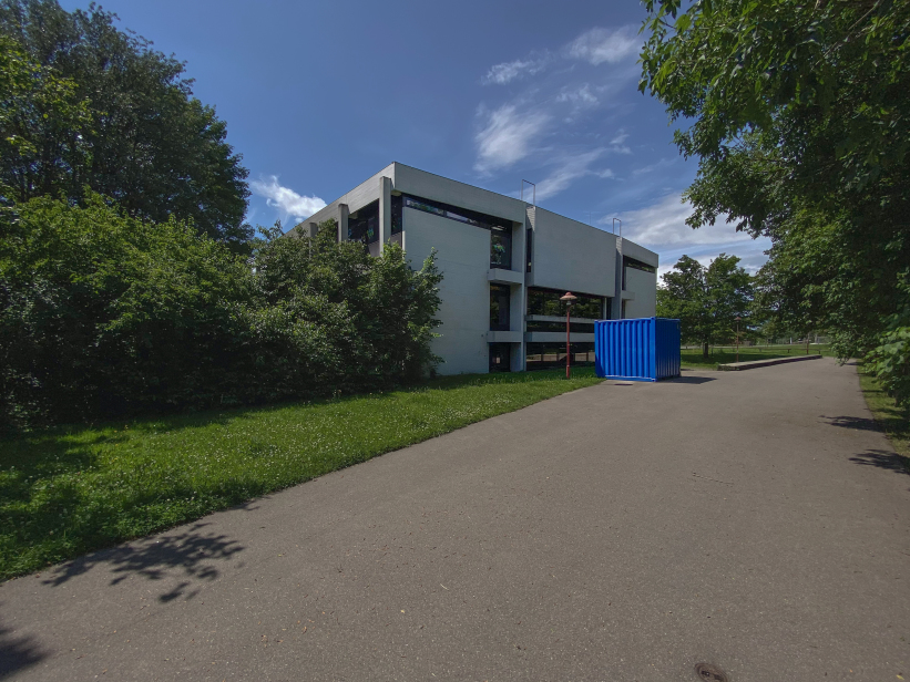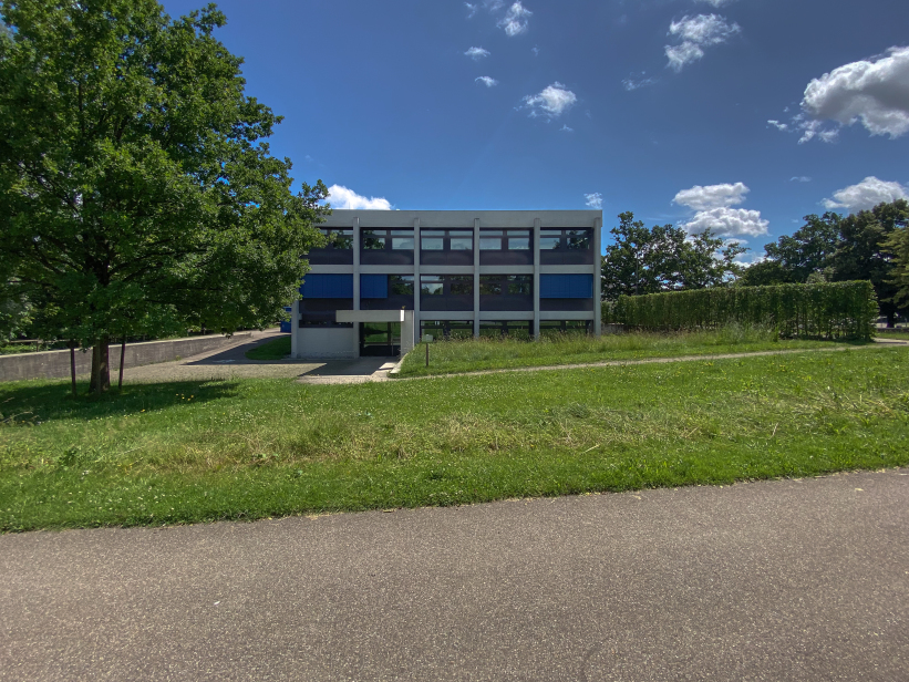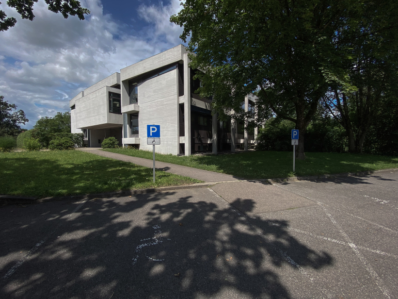The building was placed right at the entrance to Kehlen in the middle of a spacious green area. Due to its proximity to the Schussen river, the building site was prepared with a large base plate first. Kley then errected a three-storey reinforced concrete building with a flat roof on top. The building contains administration rooms, a community library, a foyer for events and exhibitions and community rooms. The façade with many window areas is partly structured by protruding concrete beams and pillars in lattice structures, but is also partly closed by differently sized exposed concrete squares with a horizontal board pattern. This creates a varied and modern impression.