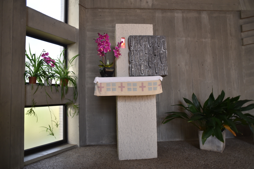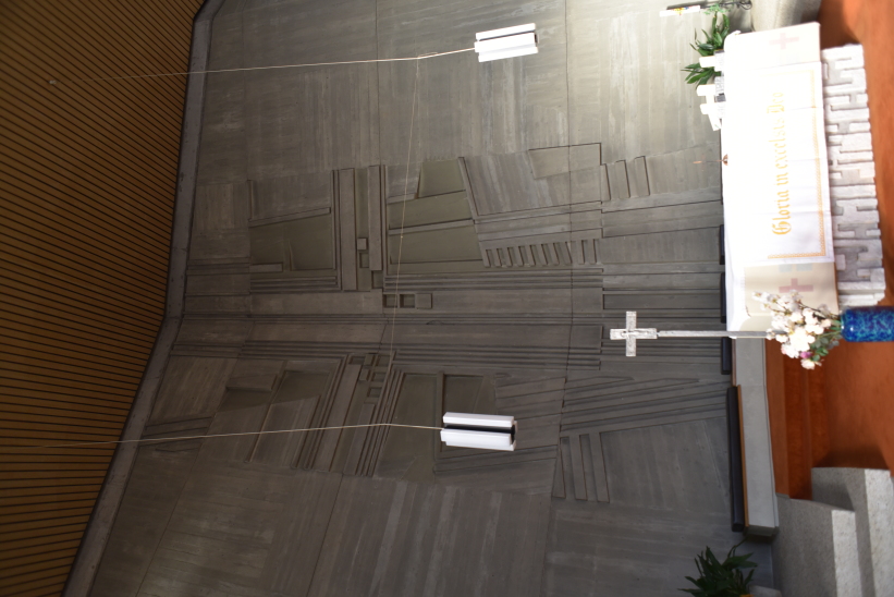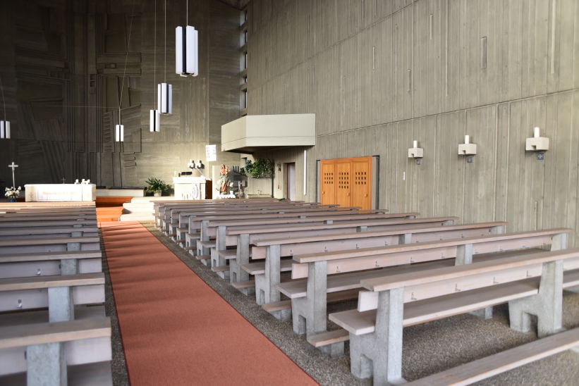 In terms of the material, the interior is dominated by exposed concrete: In addition to the rough, yet deliberately designed walls with their slatted patterns, candle holders and the legs of the pews are also made of it. The grand finale of the room’s design, however, is located on the altar wall, which tapers from the ground plan and features an expressive concrete relief that is reminiscent of a rock face, drawing a large cross in many intersecting furrows. The sculptor Karl Nuding is responsible for the decoration.