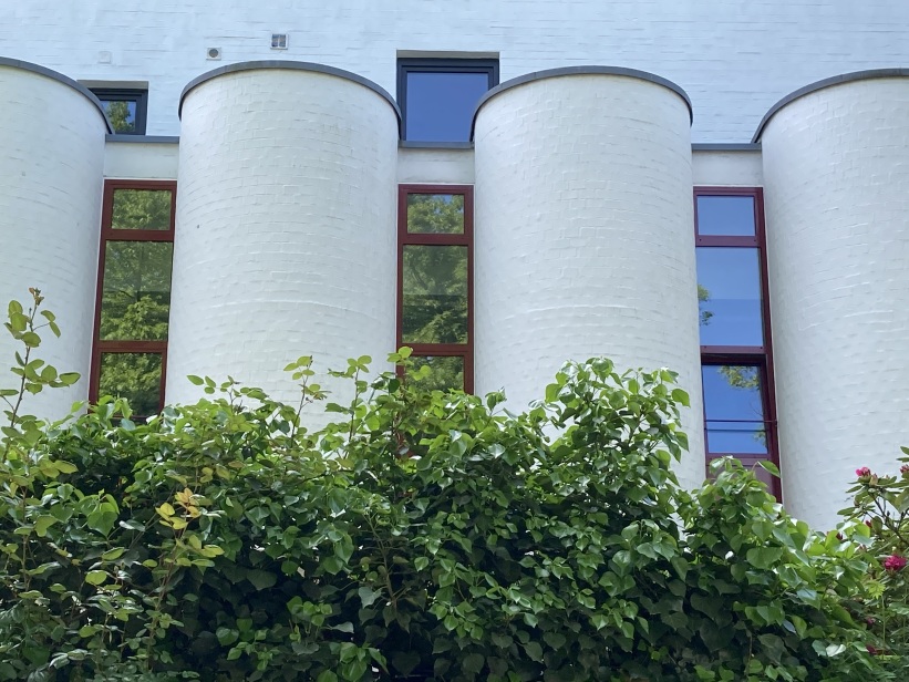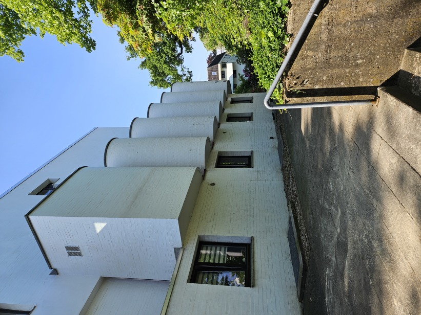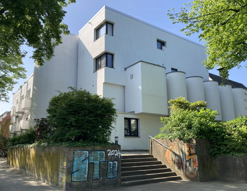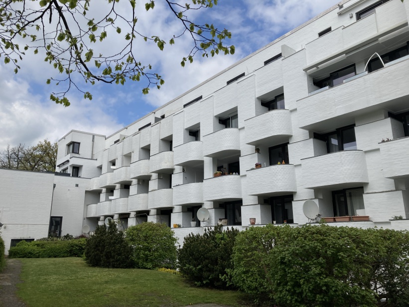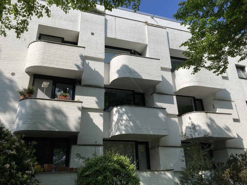 Right next to the Methodist church, which was built in 1950 according to plans by Eberhard and Hermann Gildemeister, the retirement home building by architect Friedhelm Zeuner was constructed in two phases starting in 1967. It is a three-storey, flat-roofed building with a staggered storey and whitewashed brick façades. The latter creates a structural ensemble with the church, which is also white, despite the different architectural languages of the two buildings. In contrast to the church, which is characterized by a classic building shape with pitched roof, the façade of the retirement home has plastic-sculptural elements. These include the four semi-cylindrical, windowless projections above the recessed main entrance, which alternate with narrow strips of windows, or the three-dimensional grid of projections and recesses in the brickwork, which is created by deep loggia recesses and balconies with solid brick balustrades rounded on one side.